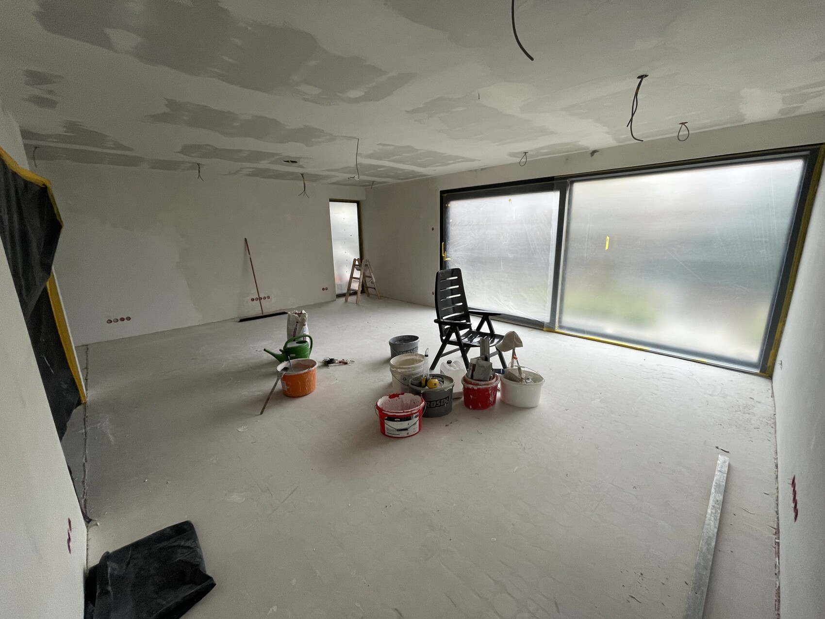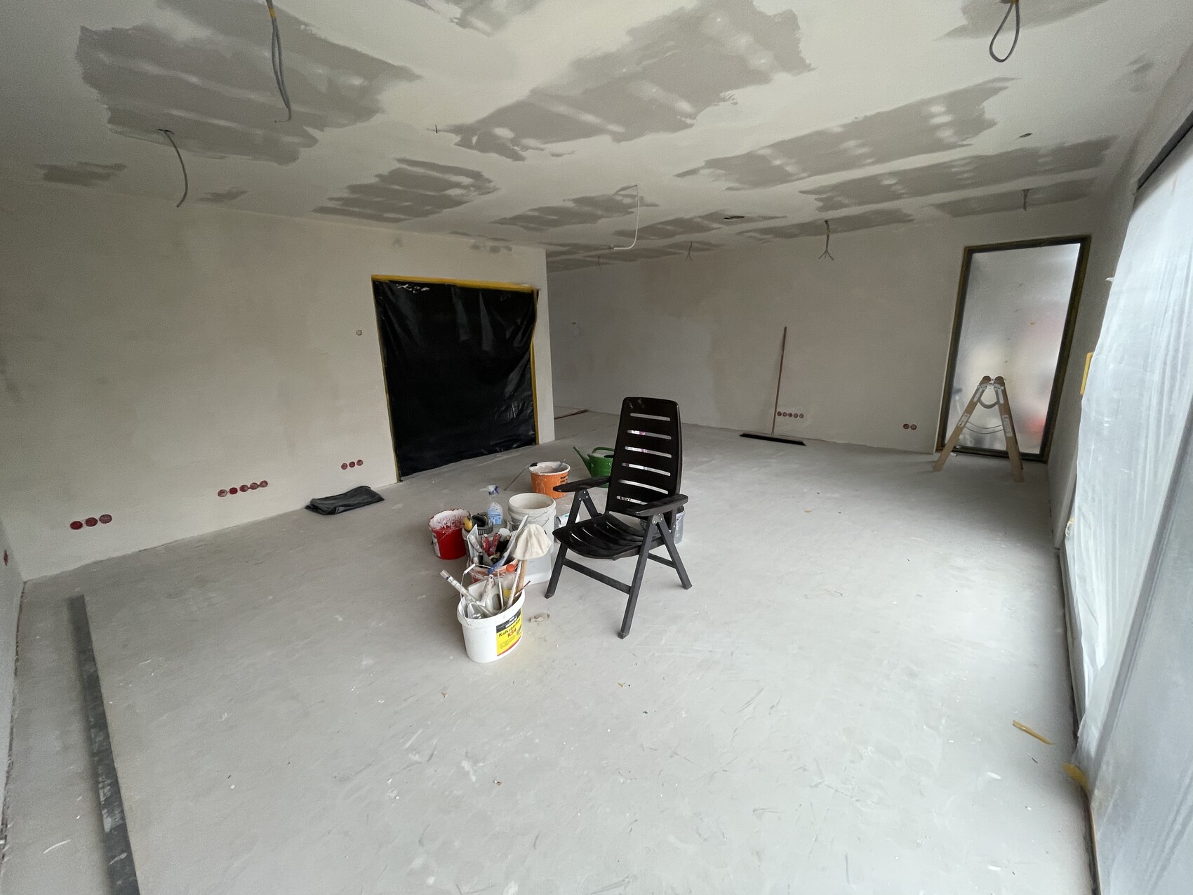 Heller Wohnraum im Bau mit unfertigen Wänden, Fensterfront und Eimern.