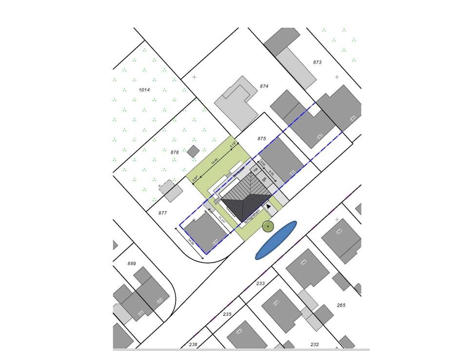 Grundstück - 21x31m. Fällt entlang der Straße von rechts nach links ca. 90cm ab, daher Eingang möglichst weit rechts, um wenige Stufen zur Eingangstür zu haben