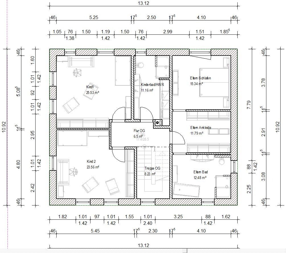 Im OG quasi links die Kinder, rechts die Eltern. Waschmaschine etc. ins Kinderbad mit integriert in einer Nische, die man mit einem Schiebetürsystem oder so auch schließen kann.