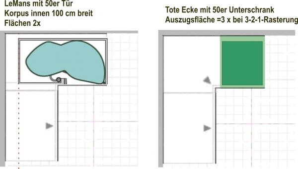 Bei Ikea finde ich in der Übersicht übrigens auch keinen 128er Schrank mit Lewie man es-Auszügen, sondern nur mit Halbkarussel, die auf jeden Fall nicht den kompletten Raum in der Ecke ausnutzen. Deine Zeichnung des Lewie man es ist da übrigens auch sehr optimistisch. Ich beziehe mich mal auf einen Beitrag aus dem toten Ecken-Thread (Bilder habe ich selber erstellt).