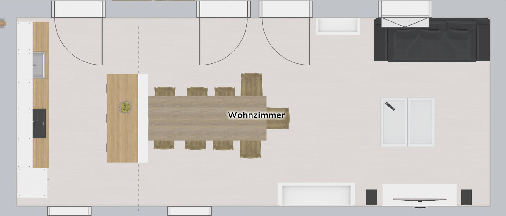 Zum Hintergrund: Wir sind eine junge, vierköpfige Familie. Sehr gerne würde ich in Zukunft mit Freunden und Familie in Zukunft gemeinsam kochen, bzw. Essen zubereiten. Den Wohnraum habe ich mal im Gesamten angehängt. Die linke Tür in der 3d Ansicht führt in den Technikraum mit ein wenig Stauraum als Speisekammer.