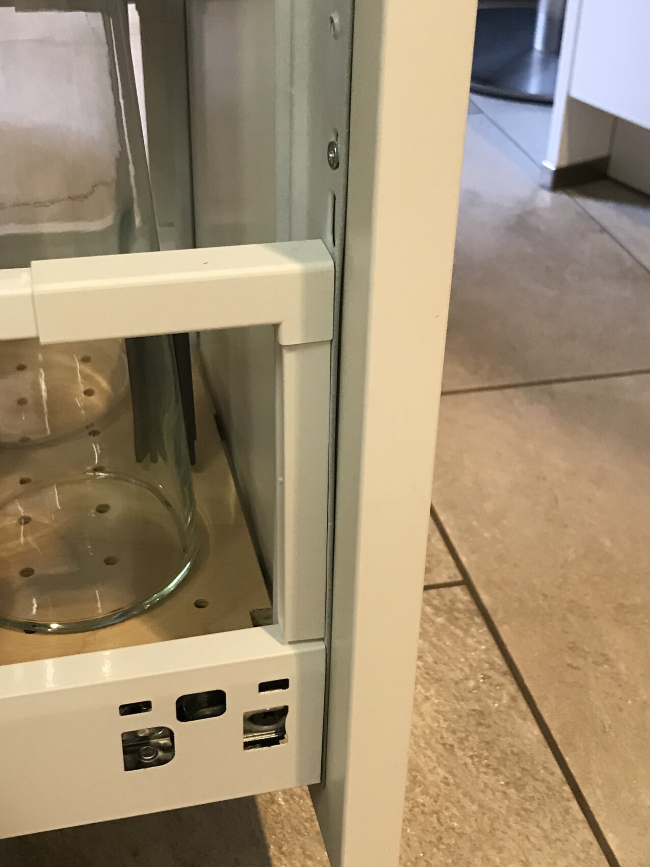 Fazit: die Türen wird mit fetten Innenscharnieren verbunden. Hässlich. Instabil. Und wer genau hinschaut (erstes Foto), der sieht, dass die Tür nicht grade verläuft.