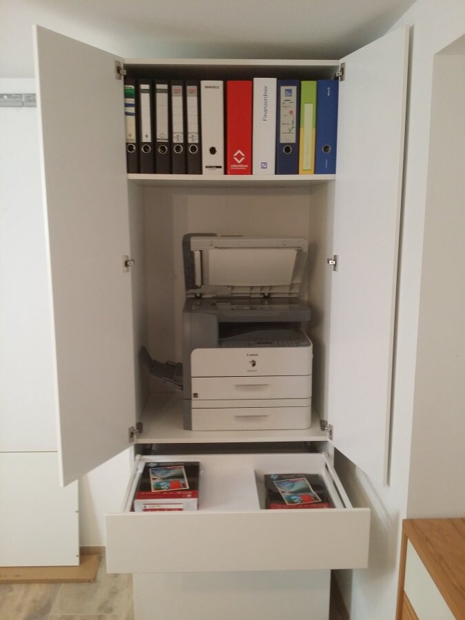 Offener Schrank mit Aktenordnern oben und Kopiergerät in der Mitte.