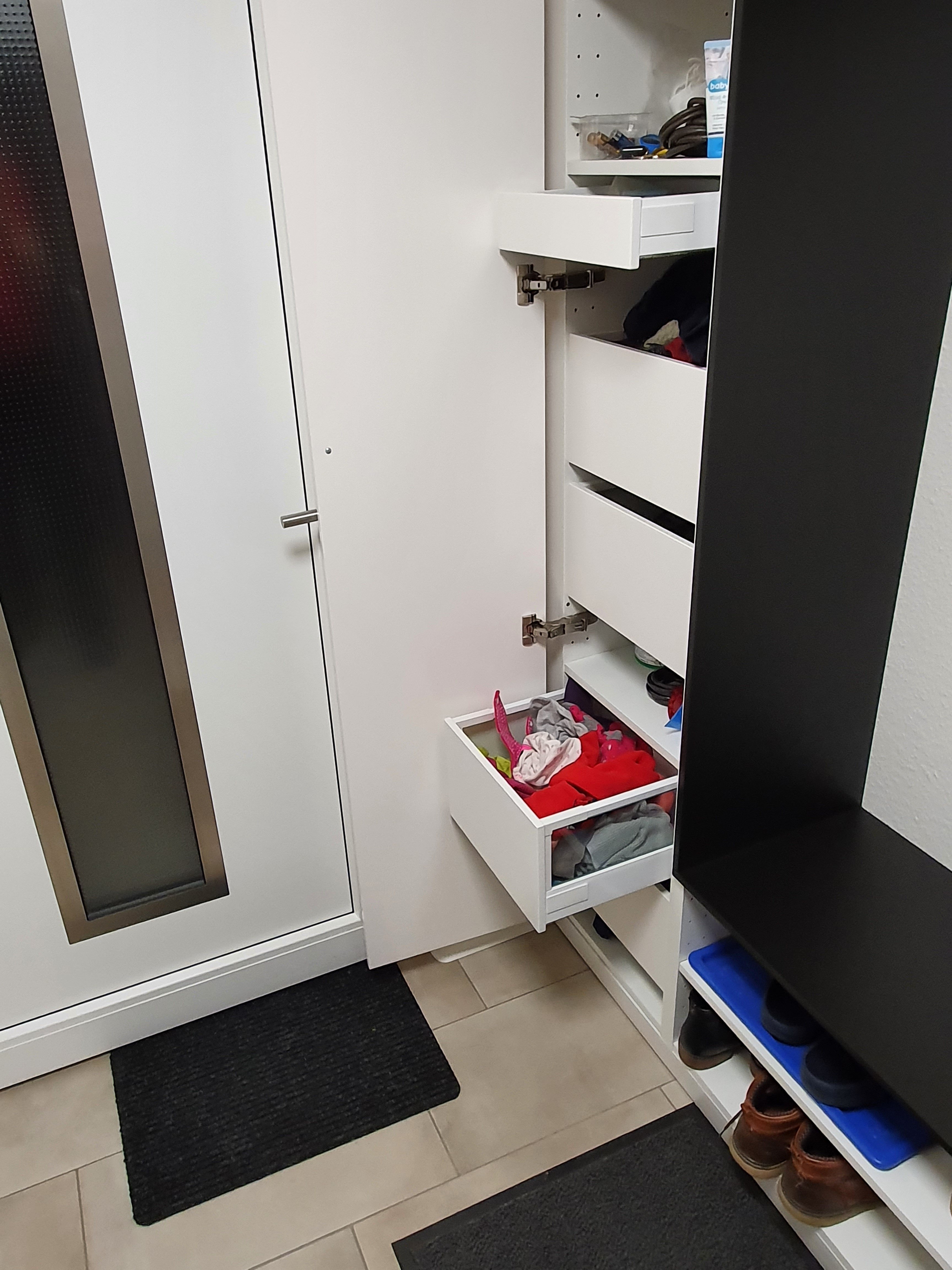 yellow_ms28.02.21 18:52Links ist ein Metod Hochschrank auch in 37er Tiefe. Nein keine Jacken, die haben wir in dem Meter Pax rechts. Links sind in der unteren Hälfte innenliegende Schubladen, jeder hat seine für Mützen und Schals, darüber noch eine für Schlüssel, Geldbeutel, oben noch Ablage. So fliegt kaum was rum, zumindest in der Theorie - wenn die Kurzen nicht wären 😀