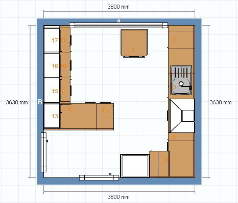 Den Küchenanteil auf der Linken Seite habe ich auch deshalb in die Küchenmitte gezogen, das ist dann der Vorbereitungsplatz. So ähnlich habe ich das jetzt auch schon.