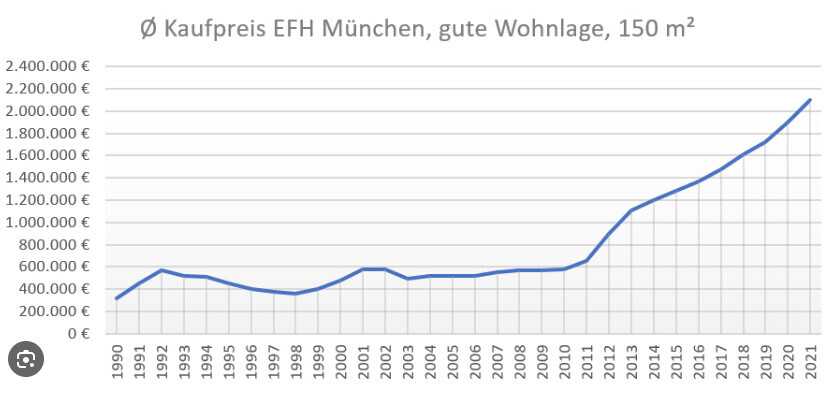 Oder Du hast Boomregionen, die den Durchschnitt nach oben ziehen. Basis München 2001 bis 2021 ==> fast vervierfacht.