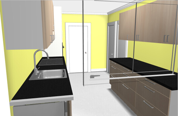 Die Breite der Küche habe ich erst jetzt richtig bemerkt. Für eine Insel finde ich die Küche zu schmal. Es ist dann nur ein Schrank, der im Weg steht.