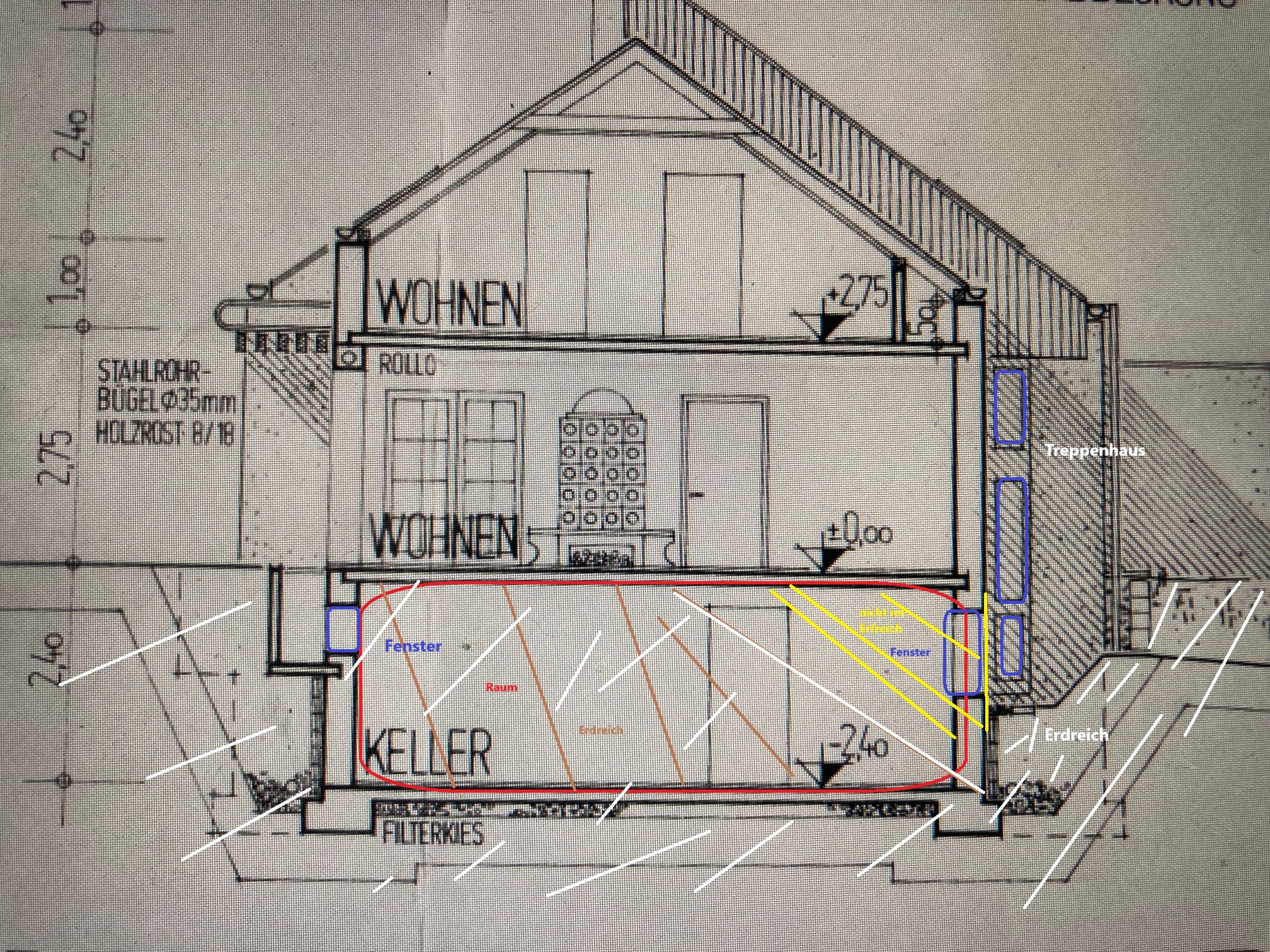 mich beschäftigt momentan eine Frage. Wir haben einen Kellerraum, der quasi Wohnraum ist, aber momentan nicht als solcher genutzt wird. Der Raum befindet sich noch im Rohbau. Innenwände wurden nie verputzt, Estrich, sowie Fußbodenheizung ist im Raum. Der Raum wird auch geheizt, ist aber nur ein Abstellraum. Es gibt zwei Fenster, eins davon als Lichtschacht. Das Haus ist Baujahr 1982 und besteht oben aus Poroton Ziegelstein (30cm), der gesamte Kelleraufbau ist als Kalksandstein (30cm) ausgeführt, Decken aus Beton. Das Haus ist außen verputzt, aber es ist keine Wärmedämmung angebracht. Der Keller ist trocken und hat keine feuchten stellen, simmel oder ähnliches. Der Keller liegt fast überall im Erdreich und ist ringsrum mit schwarzanstrich versehen. Danach kommen dann so Holkammersteinen und darüber und davor Kies (siehe Bild 1)