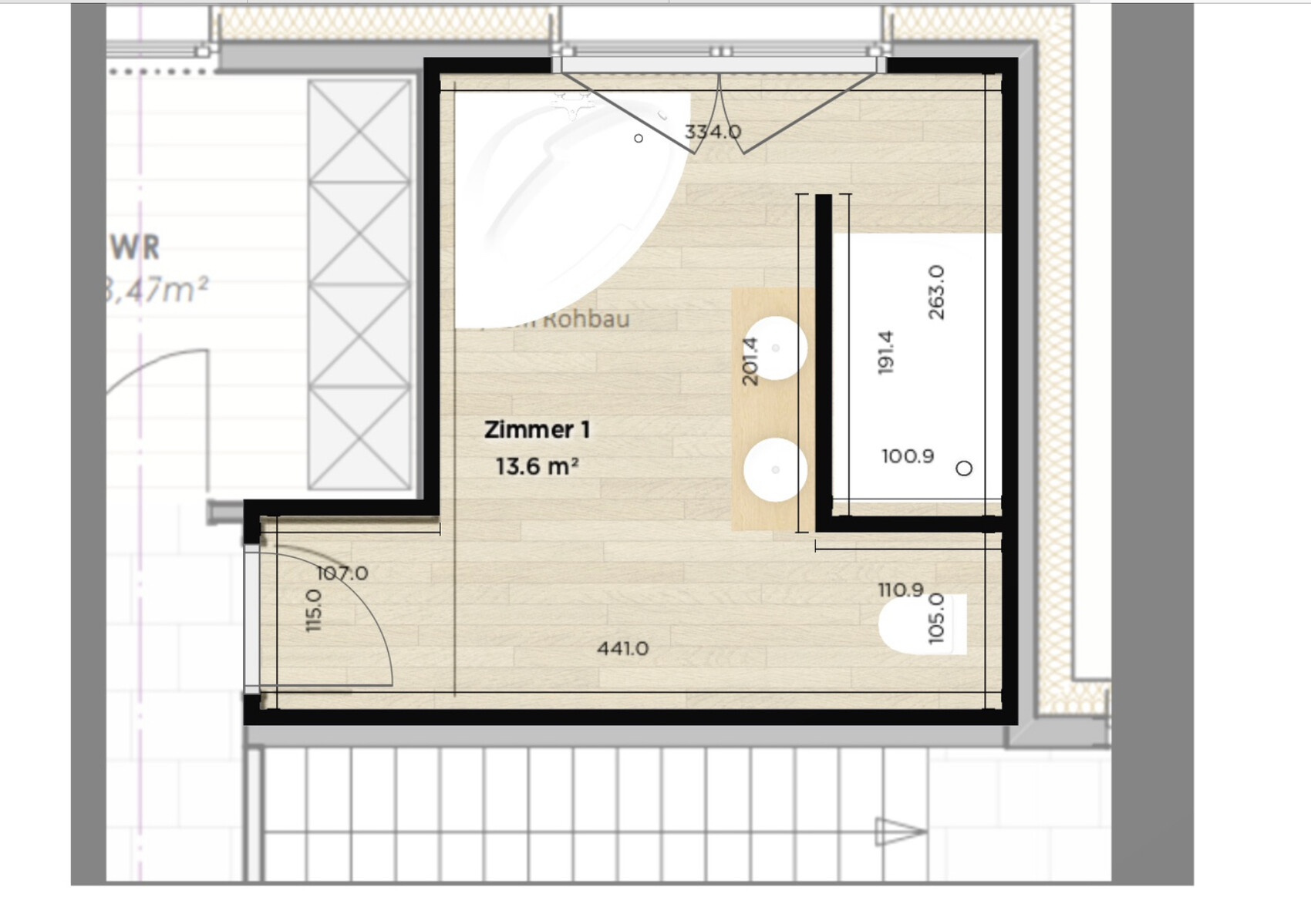 Ich bin schon wieder weiter, weil ich es eben daneben finde. Auch wenn man da noch 10 cm rauskitzelt, hat man im Endeffekt die Tür im Rücken. Wer das gern mag, bitte melden. Ich habe bis jetzt alle meine Räume, auch auf der Arbeit so eingerichtet, dass dort, wo Aufenthalt ist und nicht nur eine kurze Rast (Gäste-WC) , der Blick Richtung Tür geht.