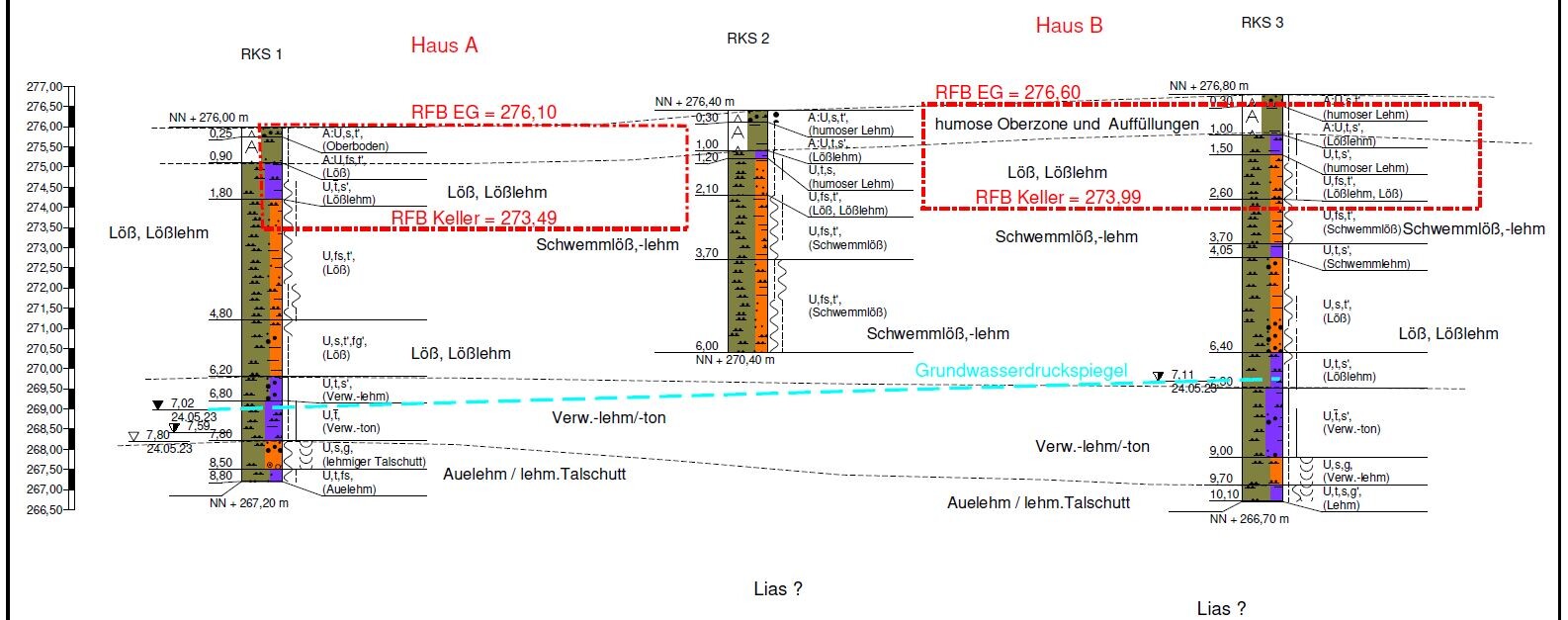 Geologischer Querschnitt mit Löß-/Lehm-Schichten, zwei Gebäude A/B und Grundwasserdruckspiegel.