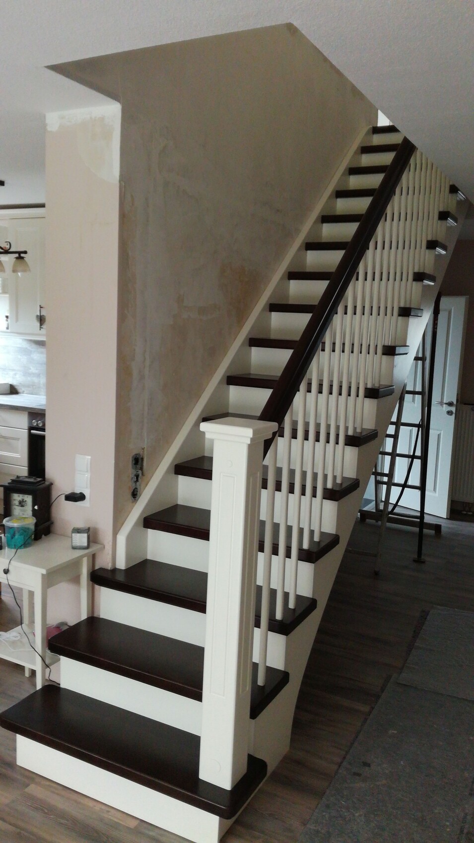 Zusammenfassung: die Wange ist an der Wand (13cm Stärke) befestigt und liegt an der Zwischengeschossdecke scheinbar nur an. Der Fuß der Treppe ist relativ groß. Ist das alles so ausreichend? Oder kommt mir die Treppe irgendwann entgegen?