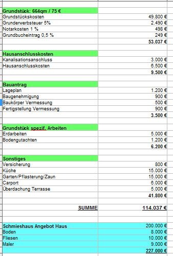 Aber was vergleichen wir? Küchen, Malen, Lampen, Böden, Strandkörbe, Geranien, Rasen, Schuppen....gehört alles zum Haus, aber nicht zu den Baunebenkosten. Die sind nämlich unabdingbar, während man theoretisch auch ne Zeitlang nur mit Mikrowelle, Wasserkocher und 120 Eurospüle leben könnte.