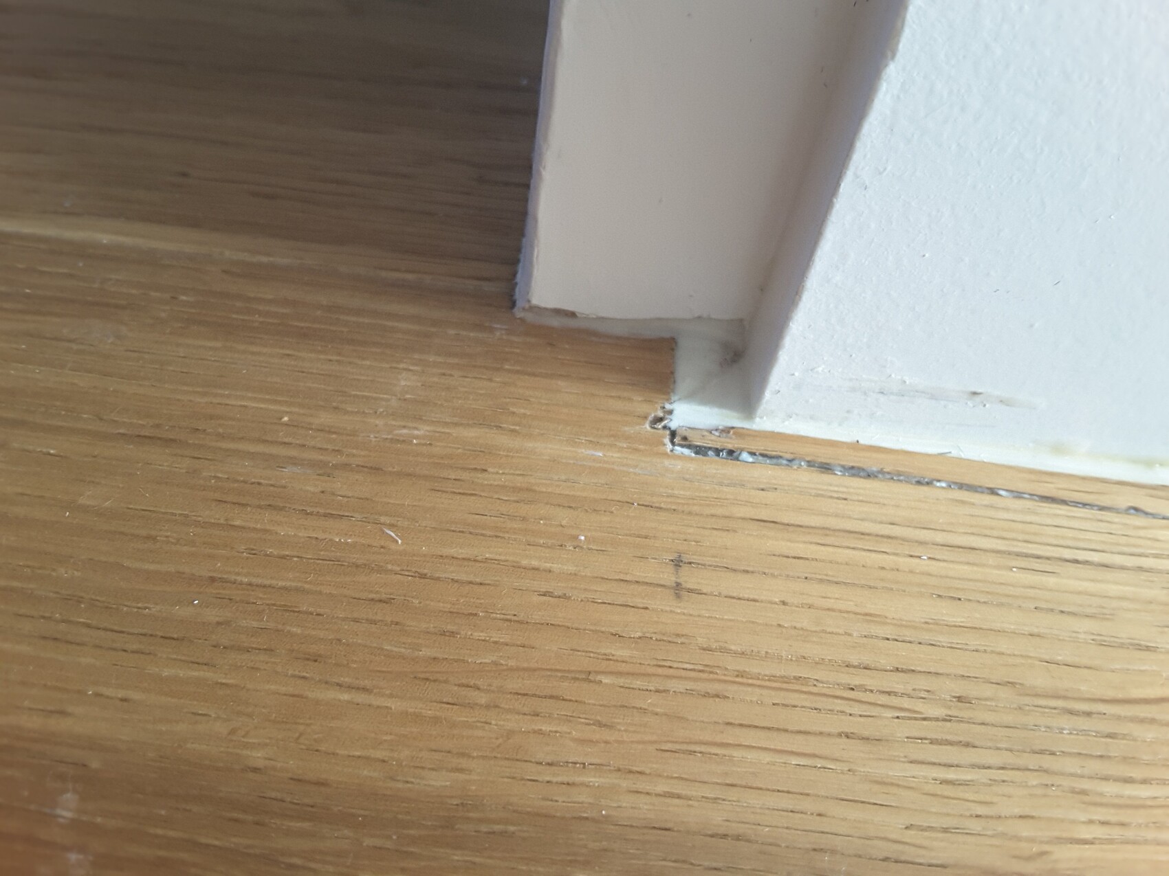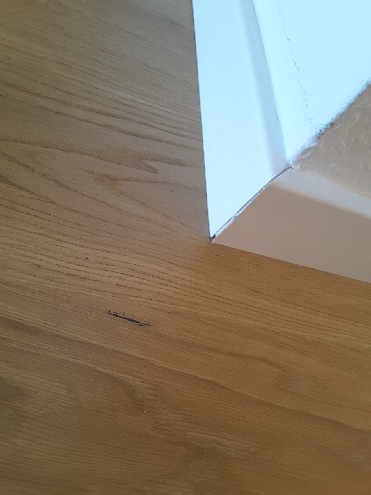 Holzfußboden mit dunkler Kratzspur und weißer Sockelleiste an einer Wandkante.