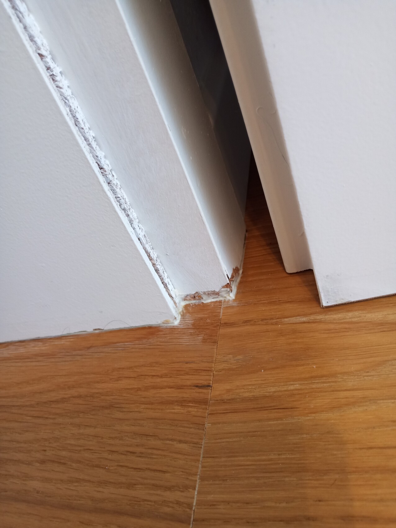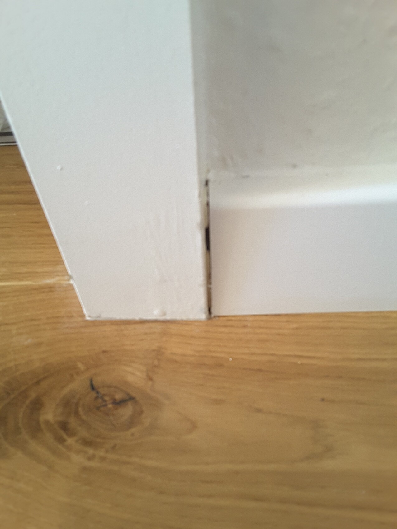 Weißer Sockelbereich an Wand-Ecke mit Spalt zwischen Sockel und Wand über Holzboden.