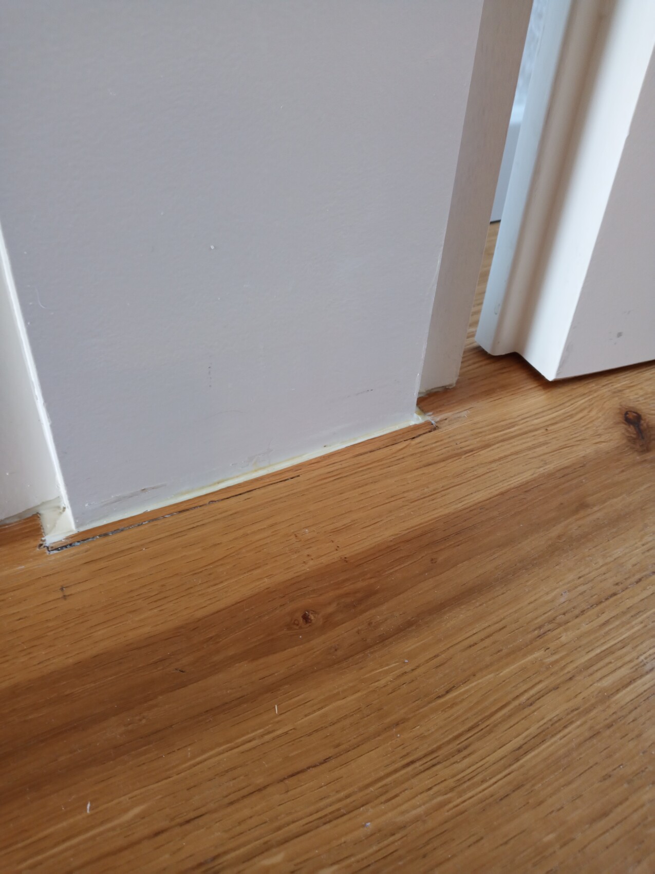Nahaufnahme eines weißen Türrahmens am Holzboden mit Spalt zwischen Boden und Rahmen.