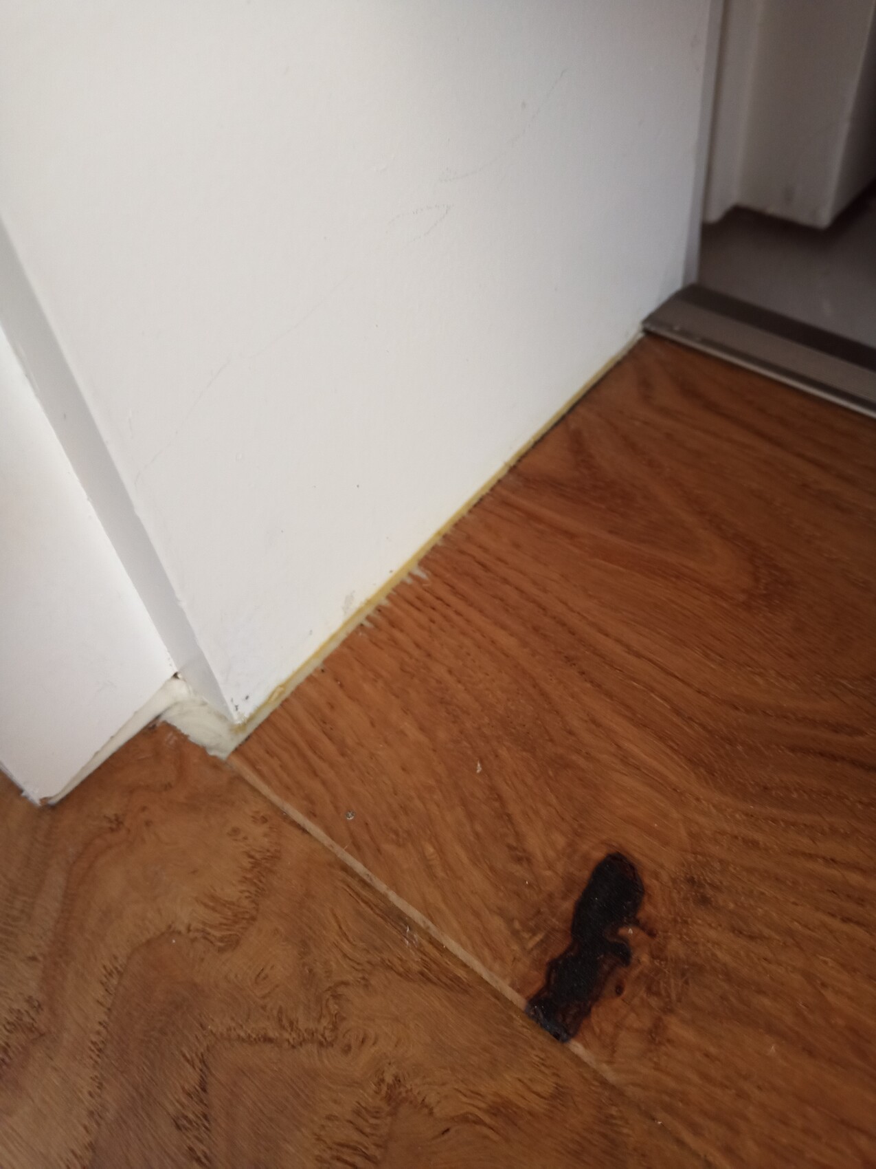 Ecke einer weißen Wand mit Holzboden; kleiner schwarzer Fleck auf dem Boden nahe der Tür.