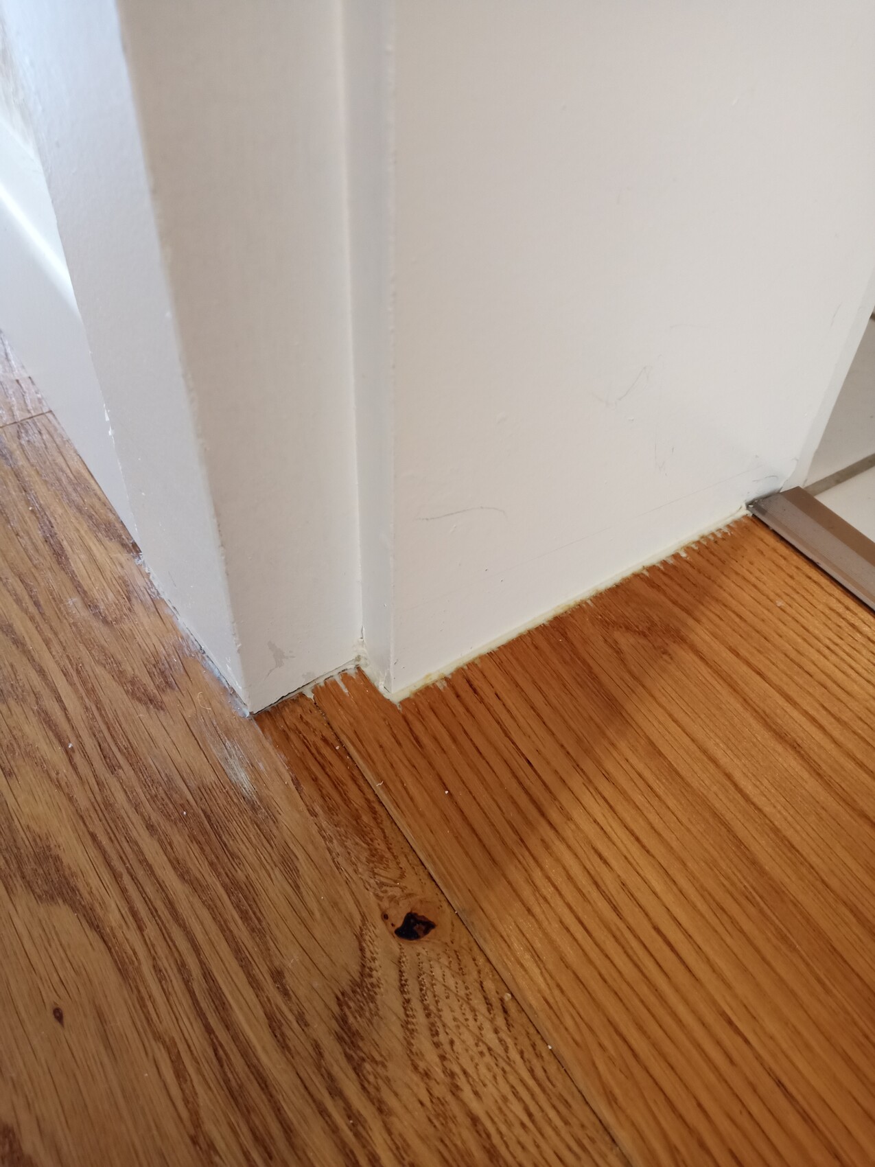 Eckansicht: Weiße Wand mit Sockel trifft Holzfußboden in der Ecke; Kratzer sichtbar.