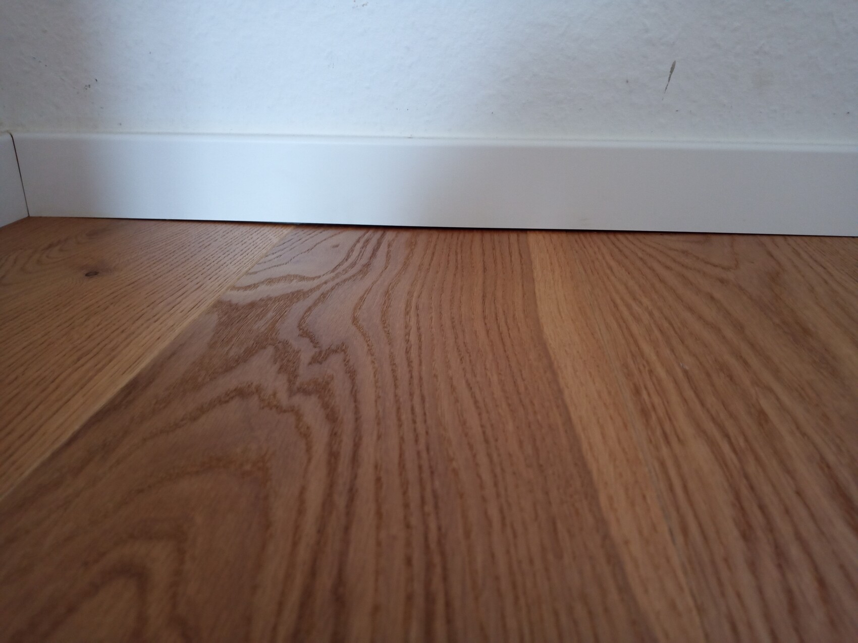 Holzfußboden mit deutlicher Maserung, weiße Sockelleiste entlang einer Wand.