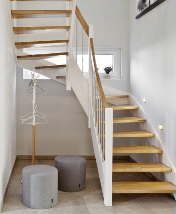 Es geht um abgebildete Treppe (Standard Fertighaustreppe), die mir überhaupt nicht gefällt, aber sie war eben schon drin. Habt ihr Ideen, womit man diese Streben/Treppengeländer ersetzen könnte, um das ganze zu verschönern?