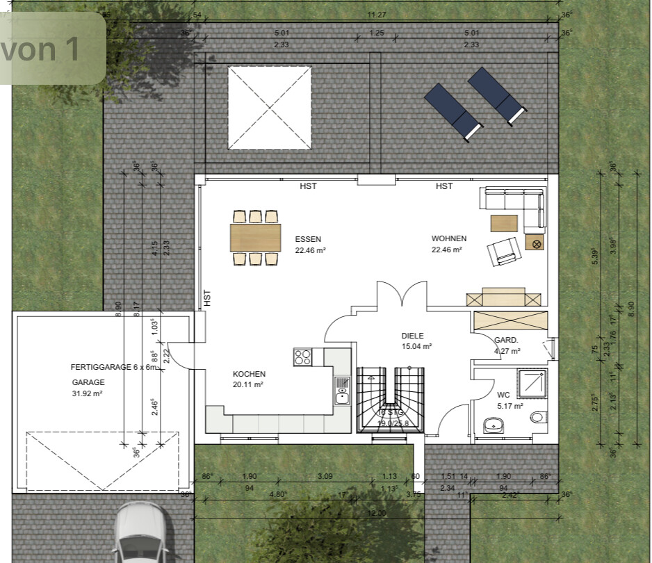 Mir kommt der Esstisch etwas klein vor. Miss den mal und zeichne eine maßstabsgetreuen ein. Überprüfe auch die anderen Möbel.