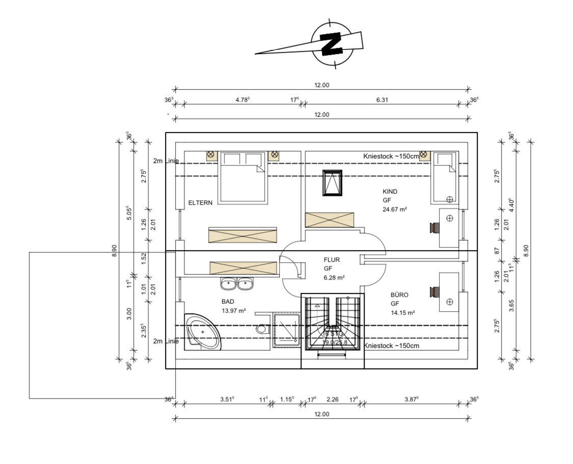 So - Die Hürde, die keine war (60 cm Kniestock) ist genommen. Nochmals vielen Dank für die Rückmeldungen. Wir sind derweil ein Schritt weiter. Jetzt haben wir Entwürfe des Architekten bekommen (Kniestock 1,5 Meter). Ertsmal grob zur Orientierung. Mir gefällt das schon ganz gut, Die Frau hat noch eins, zwei Dinge, die ich noch nicht ganz gut gefallen. (Anordnung Bad). Nach meinem Dafürhalten könnte das Schlafzimmer auch noch ein Dachfenster vertragen. Der Architekt hat uns gefragt ob wir eine Speisekammer wollen. Eigentlich nicht, aber er hat jetzt einen Entwurf mit und einen Entwurf ohne Speisekammer fertig gemacht. Mir gefällt die Variante mit Speisekammer dann doch besser, da sonst die Küche überdimensioniert ist. Ggf. hat hier aber auch noch jemand bessere vorschläge, wie man den Platz nutzen könnte