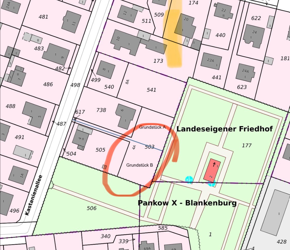 Vielen Dank für den Tipp. Ich hatte schon mit dem Bauamt Kontakt und am Dienstag nochmal ein Termin. Abstandsflächen sind hier ganz normal die 3 Meter. Auf der Flurkarte kann man auch sehen, dass auf Flurstück 441 und 623 eine ähnliche Teilung und Bebauung haben als wir sie planen.