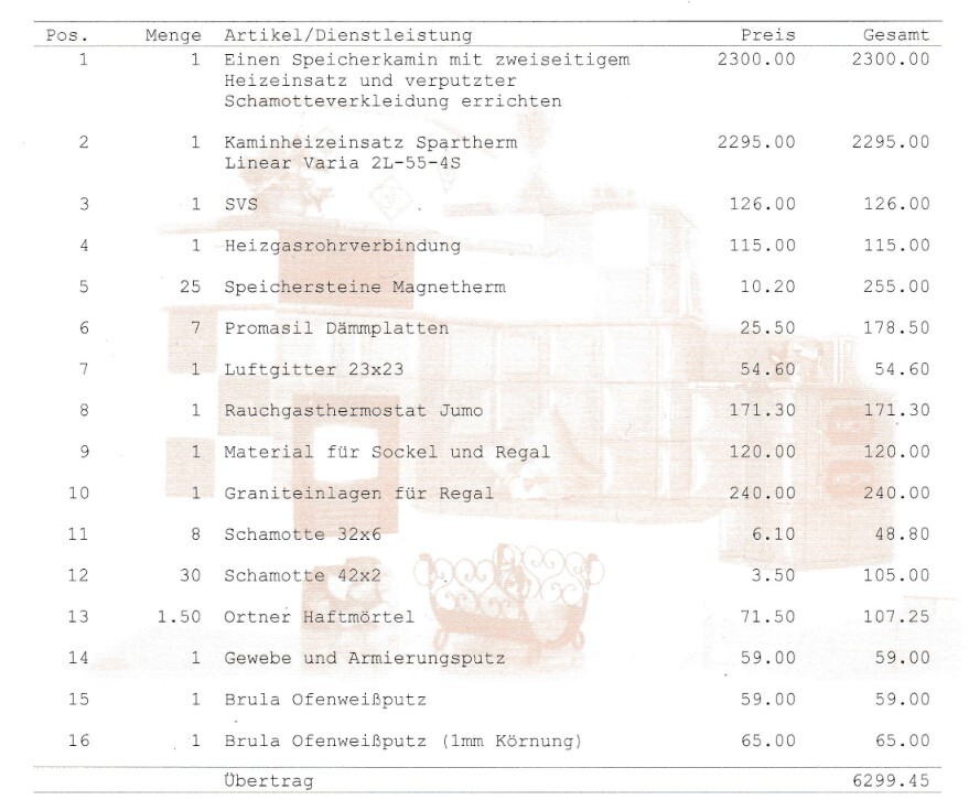 wir haben uns auch für einen Kamin entschieden und mit einem uns empfohlenen Ofenbaumeister gesprochen und uns geeinigt. Haben auch die Überhitzung des Raumes angesprochen, sowie die Kontrollierte-Wohnraumlüftung. Der Kamin ist sicherlich kleiner als Euer. Wir werden jedoch "nur" ein 30qm Wohnzimmer und eine halboffene Küche mit 15qm haben. Der Kamin wird mit Speichersteinen ausgelegt. Ich stelle noch das Angebot sowie das Bild des Kamins rein. Preis ist Netto. Brutto sind es 7.500 €.