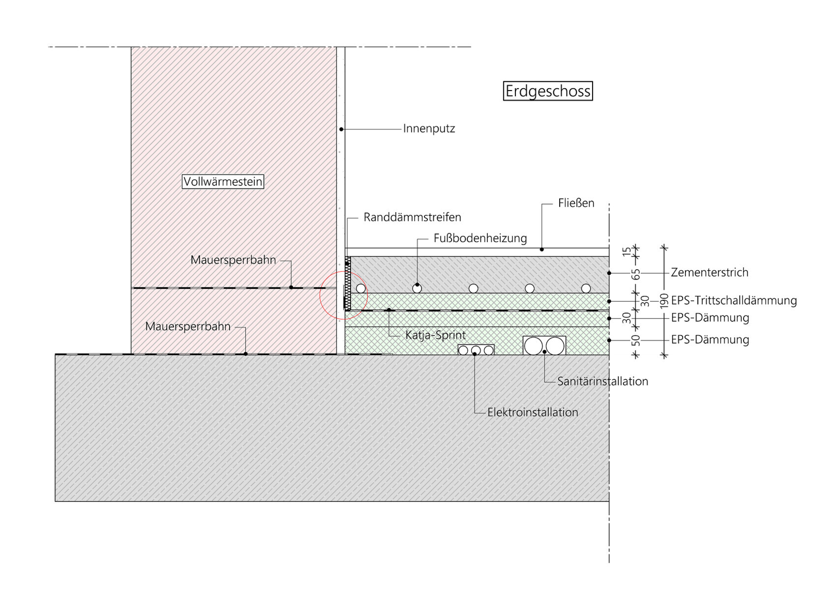 katara133706.06.18 12:43Hi, bedingt durch erhöhte Radon Vorkommen (es nicht wirklich viel) bei uns in der Region sollte man bei einem Neubau ein Katja Abdichtungsbahn auf der Bodenplatte verlegen. Mein Problem ist ich würde gerne auf der Bodenplatte in Eigenleistung die E-Installation, EDV, etc. verlegen. Problem ist natürlich wenn ich auf der Katja die Leitungen verlege beschädige ich Katja durch dübeln usw.. Jetzt habe ich mit meinem Schwager gesprochen der das gleiche Problem hatte und der hat es folgendermaßen gelöst (siehe Bild). Was mir aber unklar ist wie schließ ich die Katja an die Mauersperrbahn über der Kimmschicht an? Ich habe mal eine kleine Zeichnung angefertigt und die Stelle Rot markiert. Vllt. kann mir jemand aus dem Forum ja hierbei helfen? Um die Katja in dem Bereich anzuschließen müsste eigentlich der Putz an der Stelle ja unterbrochen sein... Oder Reicht es vllt. auch die Katja einfach ein bisschen den Putz hochzuziehen (habe mich noch nicht erkundigt ob das überhaupt Möglich ist). Oder Reicht es sogar (Abdichtung ist ja nur für Radon gedacht) die kleine Lücke zwischen Katja/Putz/Mauerwerk in kauf zu nehmen?