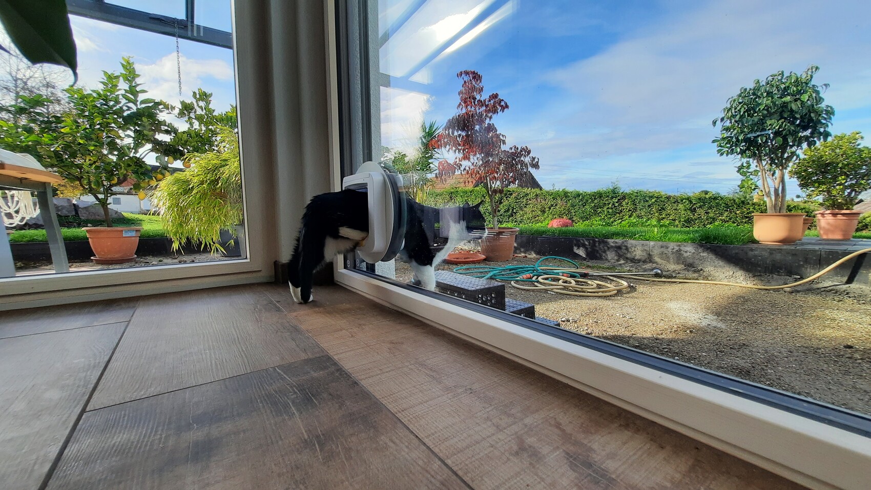 Katze steckt Kopf durch Katzenklappe im Glasschiebetor; Garten mit Topfpflanzen.