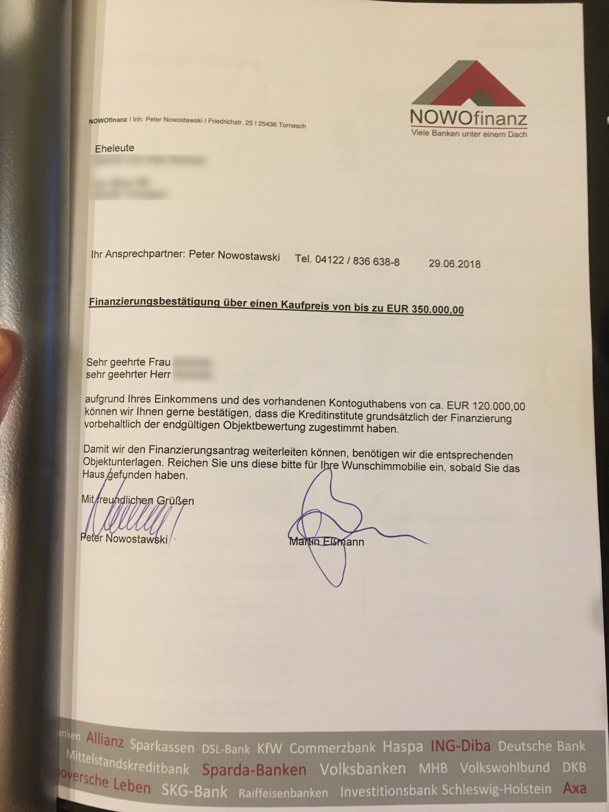 Zuvor hatten wir immer eine allgemeine Finanzierungszusage bis zum Kaufpreis von 350.000,- €, nachdem wir bei einer Besichtigung den kürzeren gezogen hatte, weil wir diese nicht direkt vorweisen konnten und Nachens die schon alles dabei hatten.