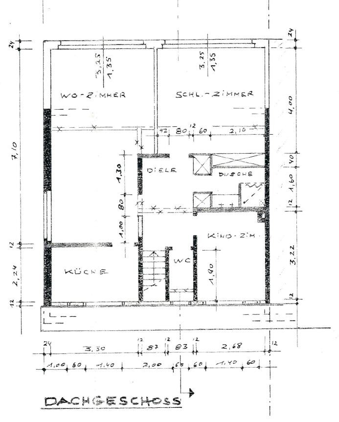 Grundriss des Dachgeschosses: Küche, Diele, WC, Kinderzimmer, Schlafzimmer, Treppe.