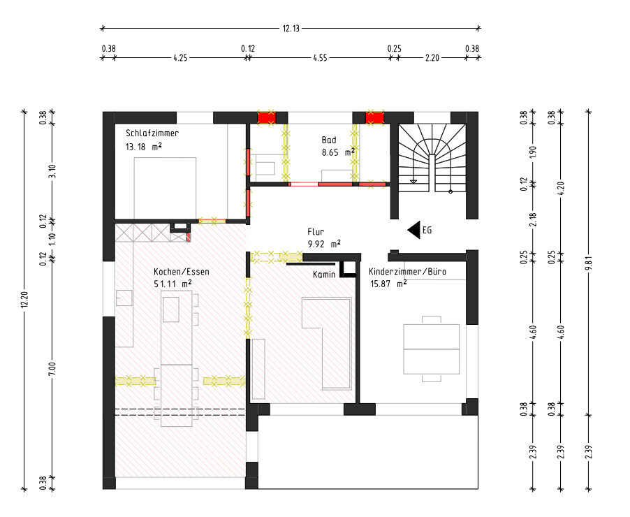 Warum habt Ihr die rot markierte Wand nicht stehen gelassen? Da hätte es sich wohl eher nicht gesetzt.Der Gedanke war, dass die Küche dann zu beengt ist wenn dort die Wand noch steht. Und offener hat uns dann einfach auch besser gefallen.