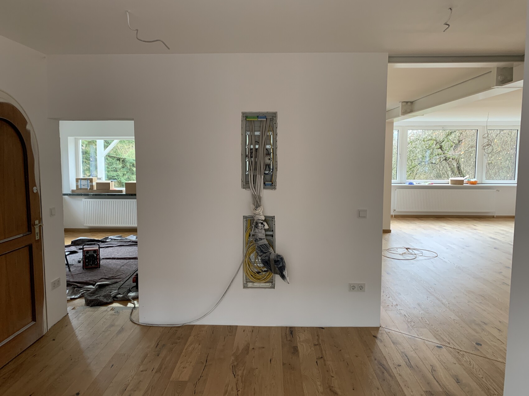 Mit den Elektroarbeiten haben wir auch schon angefangen, neuer Sicherungskasten inklusive Netzwerkschrank wurde installiert. Jetzt muss noch der Schutt raus, dann kann der Elektriker weiterarbeiten.