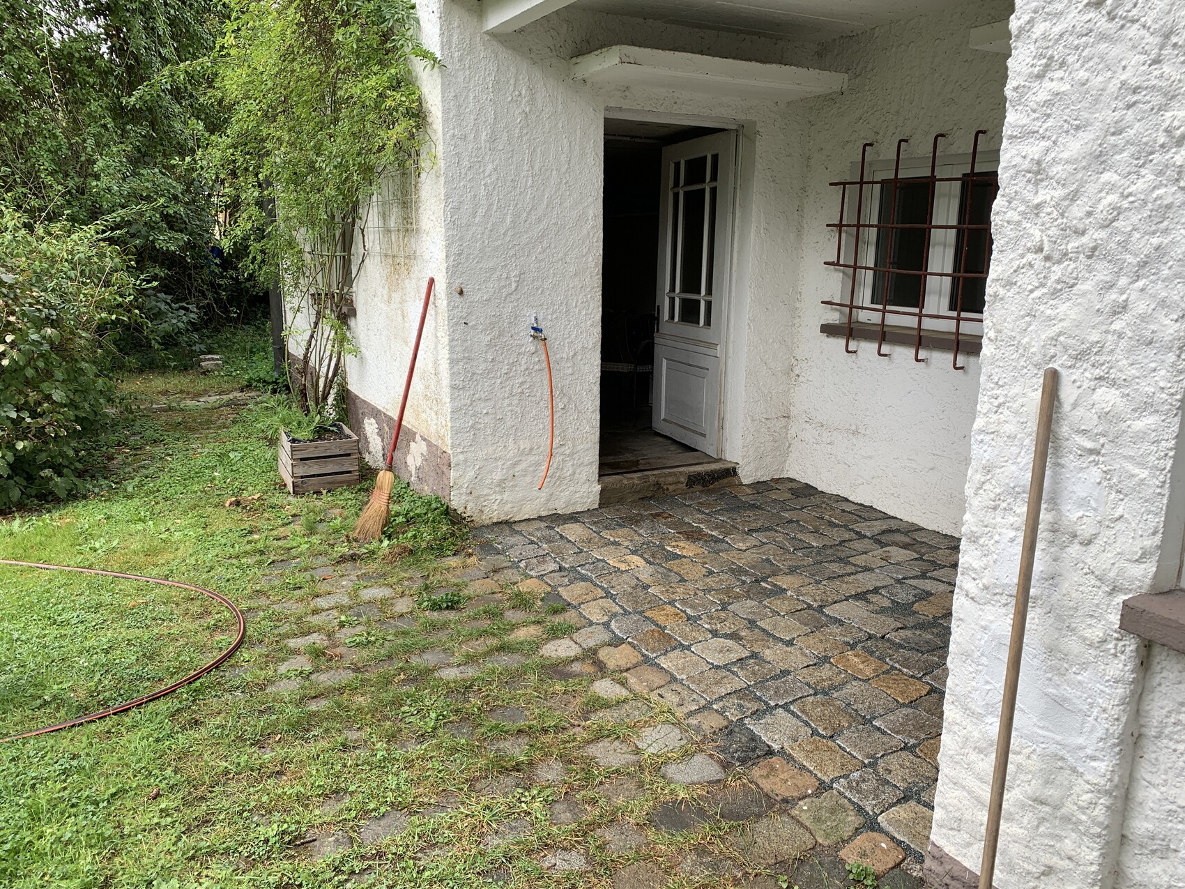 - Außen haben wir noch alte Eisenbahnschwellen als Pflaster entsorgt und Altstadtpflaster ergänzt.