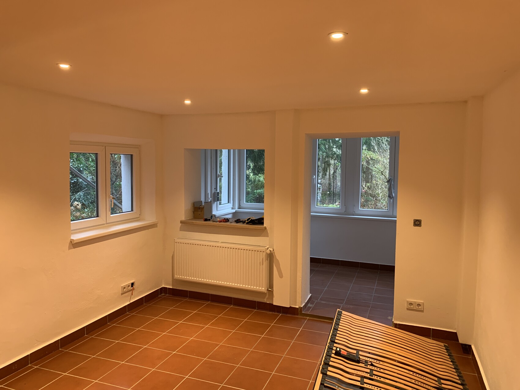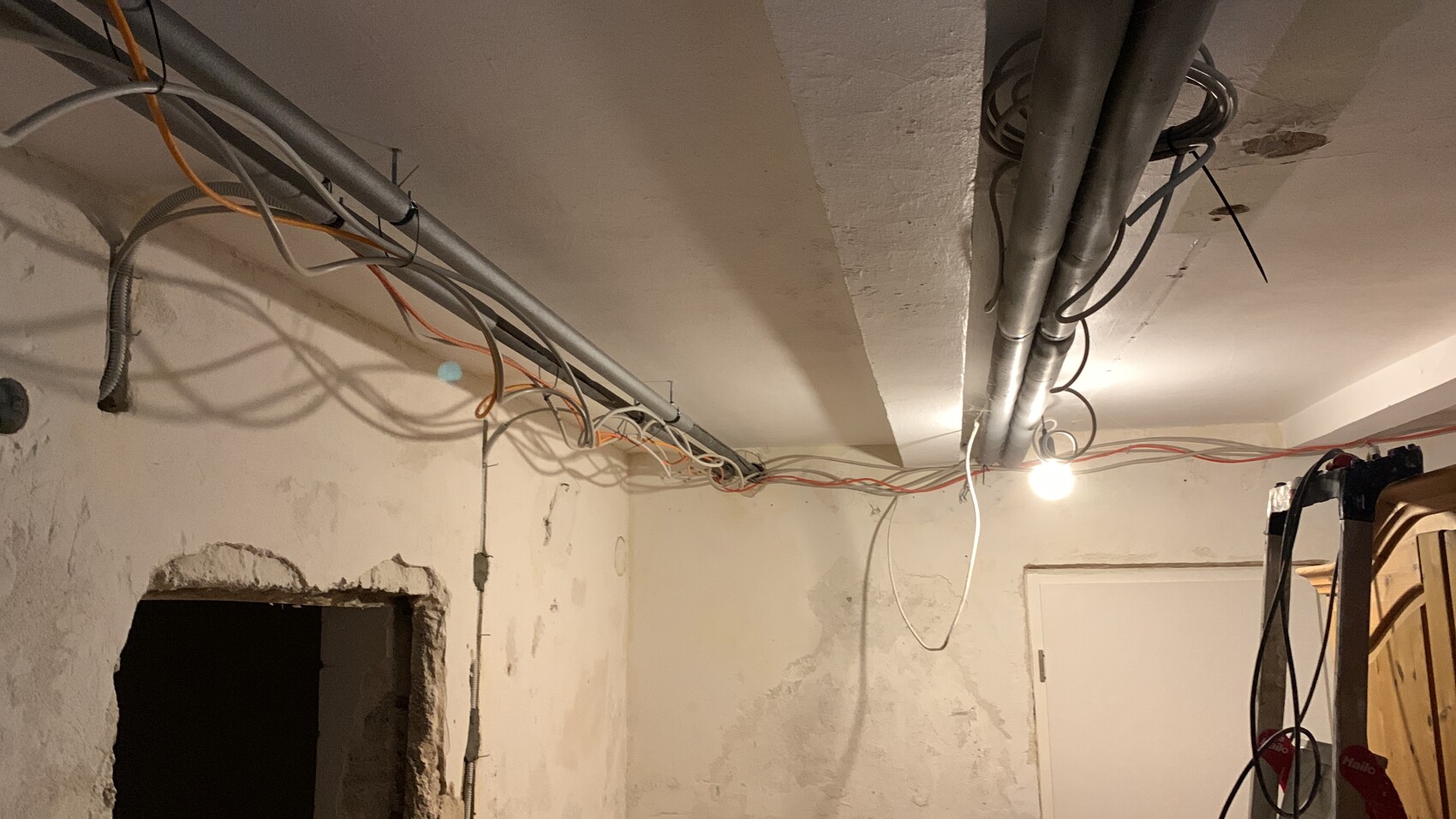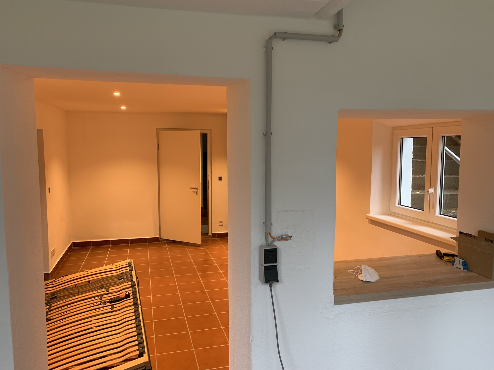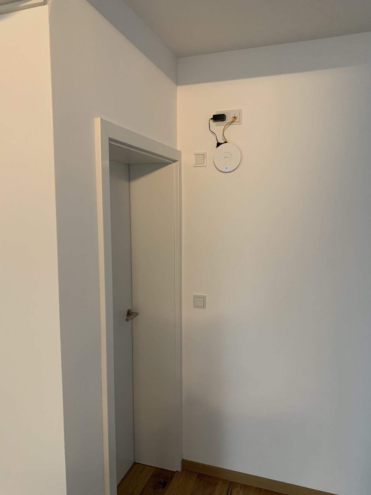 - Das EG ist soweit finalisiert, eingezogen sind wir Ende 2023. Türen sind nun eingebaut. Zum Teil Raffstores an den Fenstern zu den Nachbarn. Der WLAN Accesspoint hat ein kurzes Kabel bekommen, der Ausschalter ist geblieben.