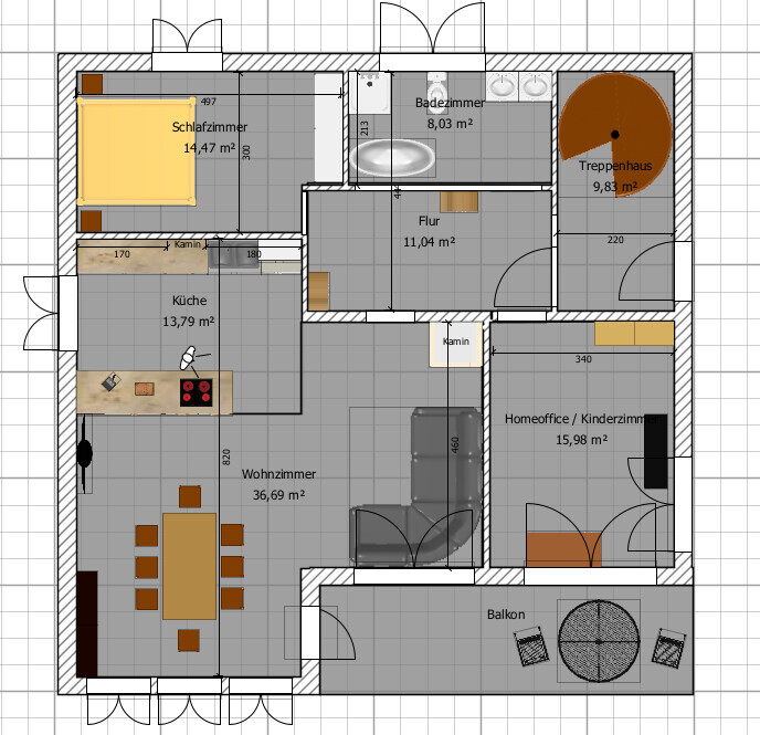 Im neuesten Entwurf hab ich jetzt mal anders geplant und das Schlafzimmer in die heutige Küche verschoben damit die Küche und das Wohnzimmer nicht so in die Länge gezogen sind, sondern auch mehr in die Breite. Zudem wäre das Wohnzimmer dann auch durch einen Kamin ausstattbar.