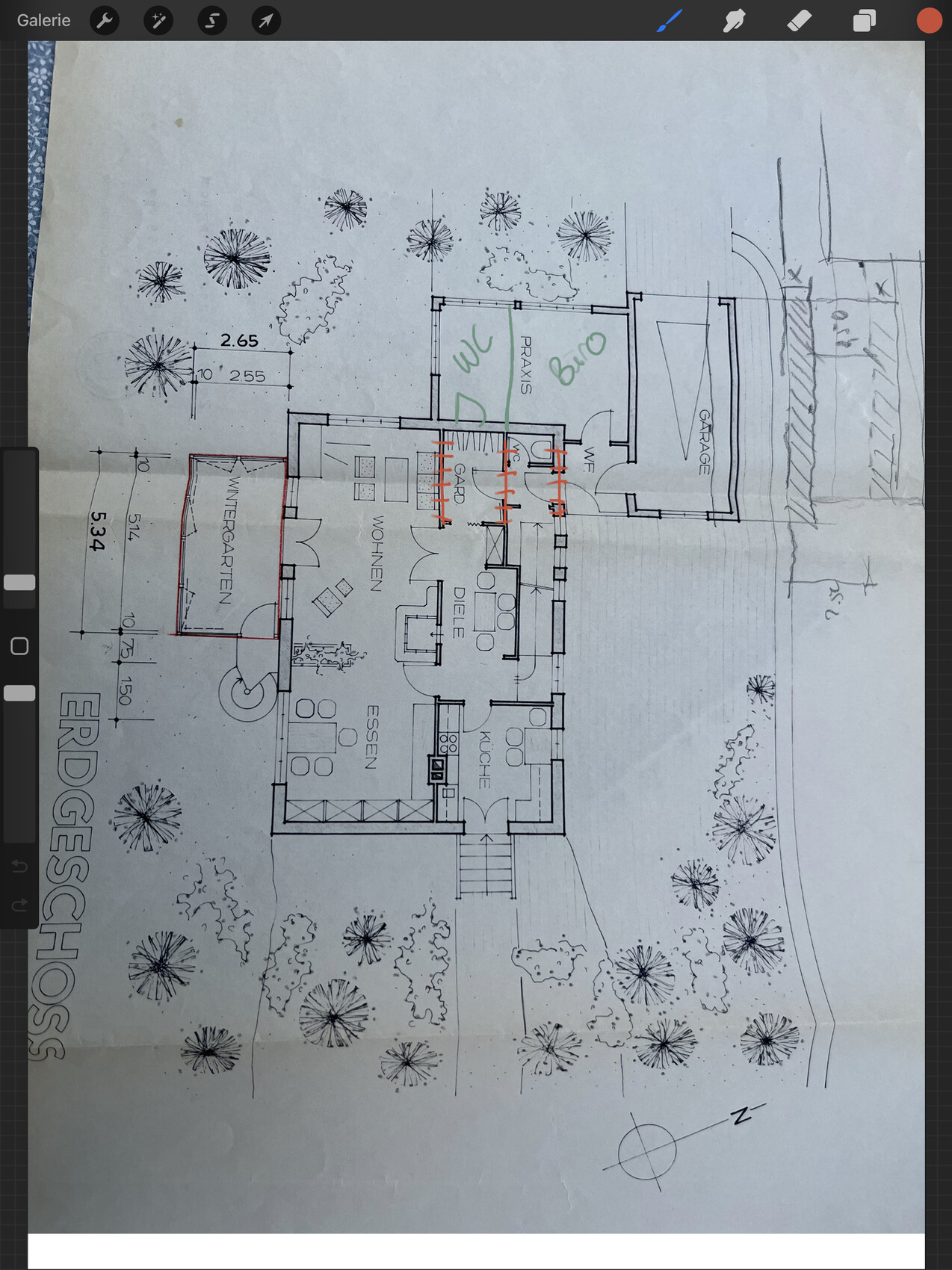 Ich würde die Miniwände im Eingangsbereich rausreißen, das WZ als Schlafzimmer, Praxis als Büro und Toi. Ich könnte mir das gut vorstellen. Da ist wirklich viel Potential drin.Meinst du das so? Die Wände in rot raus? Ich verstehe, wieso man darauf kommt. Tatsächlich sind da zwei oder drei Treppenstufen dazwischen. Also zwischen Eingang und dann Keller. Und da ist auch keine Zwischenwand sondern nur die Treppen als Begrenzung. Aber den Raum öffnen zur Diele hin würde ich auch.