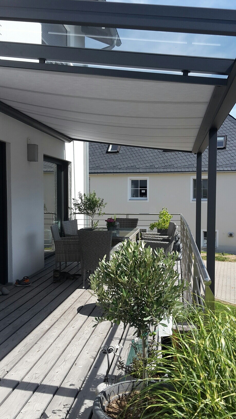 ich bin neu in diesem Forum und plane momentan eine Terrassenüberdachung 560x300 cm In Hamburg. Eine entsprechende Anfrage habe ich an KD geschickt und in der kommenden Woche habe ich einen Ortstermin. Nun habe ich noch folgende Fragen ehe der Herr zur Begutachtung kommt. Ich plane die TerrassenÜberdachung an der linken Seite komplett mit Glasscheiben zu schließen. Benötige ich dafür ein Streifenfundament oder geht das auch günstiger? Außerdem wollte ich euch fragen, ob mir jemand ein Foto mit einer Unterbaumarkise zur Verfügung stellen könnte. Ich habe hier im Thread leider keine gefunden. Wir planen die Terrassenkonstruktion in Anthrazit und möchten eine helle Markise, in etwa so wie die Sonnensegel ( Hellbeige).. vielleicht hat jemand so etwas ähnliches gerade verbaut. Für eure Rückantwort bedanke ich mich...