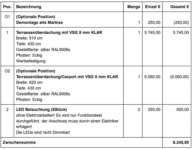 Für die reine Überdachung ohne jeglichen Verschattung inkl. 2x6 LED in 5,1mx4,3m mit VSG 8mm wären wir auf auf 7.370€ gekommen, ohne Verhandeln.