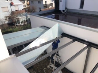 7,00 m x 3,40 m, eckige Pfosten, eckige Blende, 8mm VSG milchig