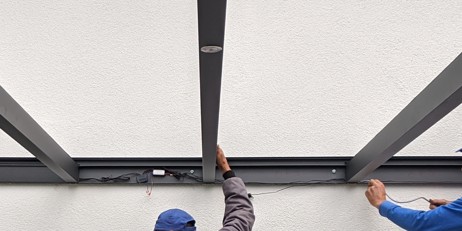Die Lampen wurden vor dem Ein- bzw. Aufsetzen der Sparren bereits montiert und die Kabel nach oben raus hängen lassen.