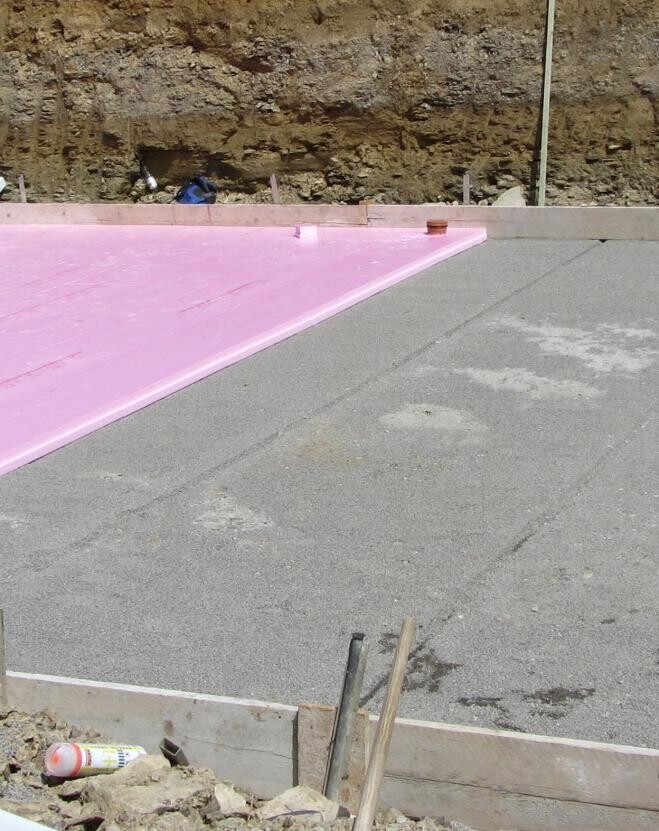 Baustelle mit pinken Dämmplatten auf Fundamentplatte und Erdarbeiten sichtbar