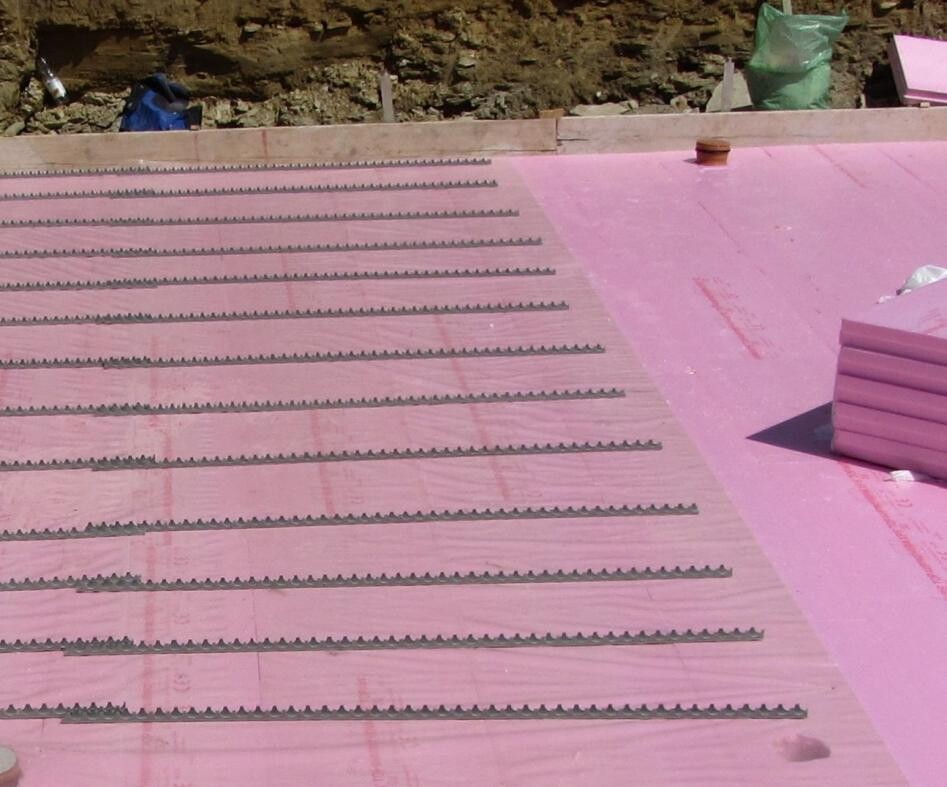 Rosa Dämmplatten auf einer Dachbaustelle mit Reihen von Dämmstreifen