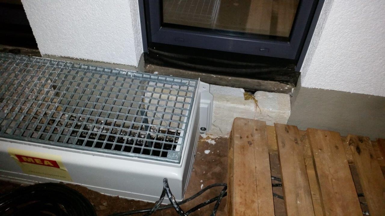 Die Kellerdecke selbst ist auf der Höhe der Fenster noch gar nicht gedämmt. Man hat für einen Lichtschacht einfach ein paar Blöcke von der Perimeterdämmung ausgeschnitten und eingeklebt (siehe Fotos).