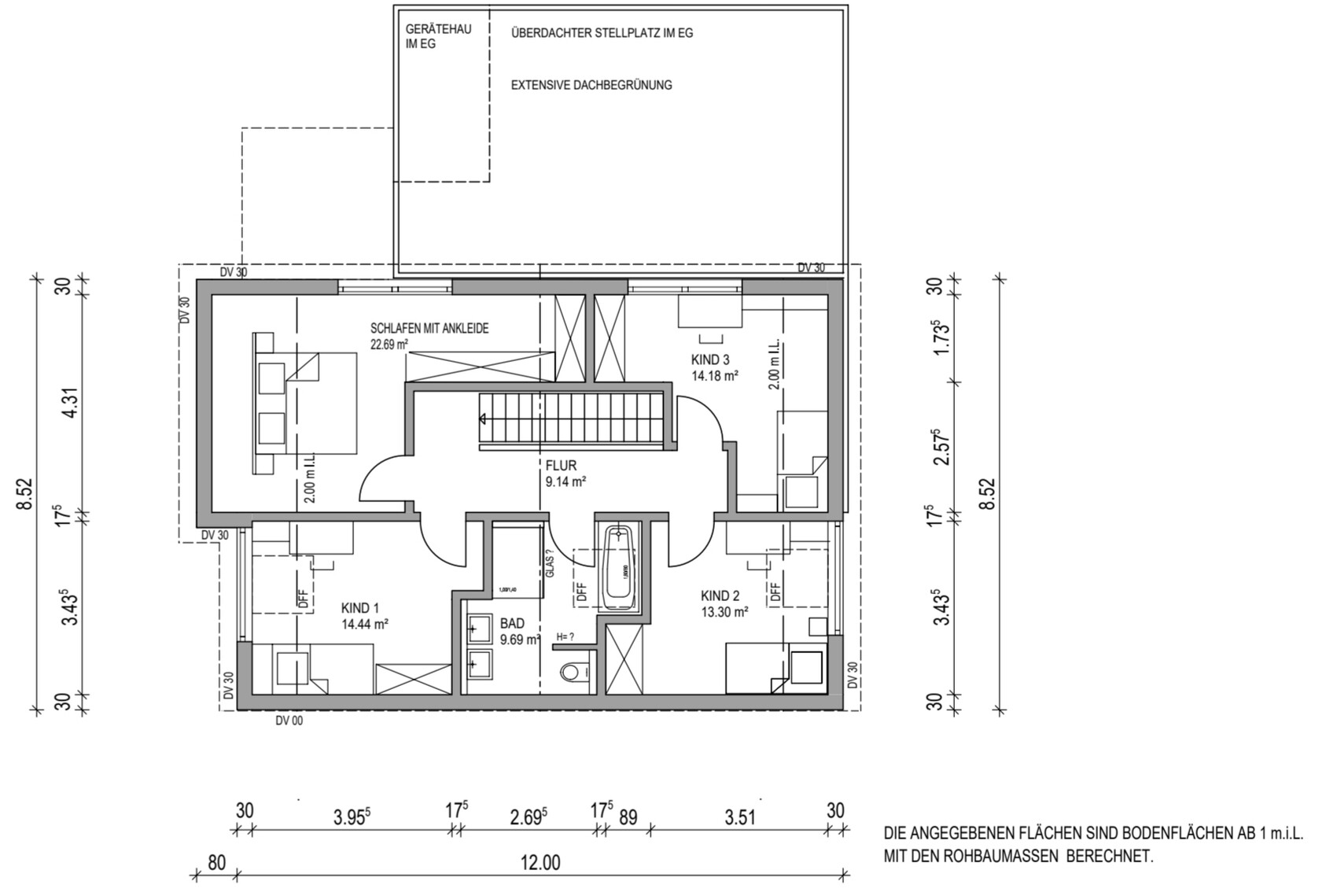 Grundriss II (Max): 96m² * 1,5 = 144m²
