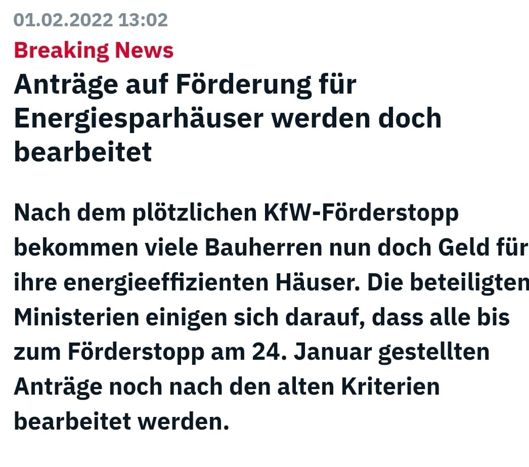 Breaking News: Anträge auf Förderung für Energiesparhäuser werden bearbeitet; Datum 01.02.2022 13:02