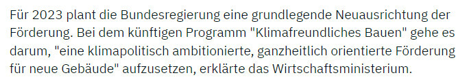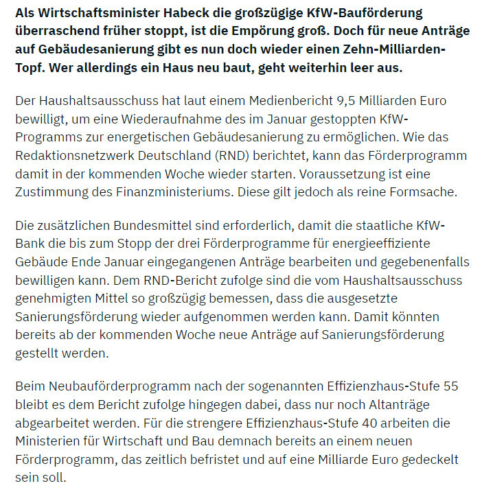 Na, dann werden wir zwar keine Förderung fuer unseren Neubau bekommen. - Aber wenigstens haben wir wieder Chancen Handwerker zu bekommen. Komischerweise melden sich jetzt vor Wochen angefragte Gewerke. Ich seh das jetzt einfach mal Positiv 😉