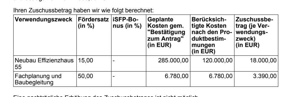 Tabelle zur Zuschussberechnung mit Verwendungszwecken, Kosten und Zuschussbeträgen
