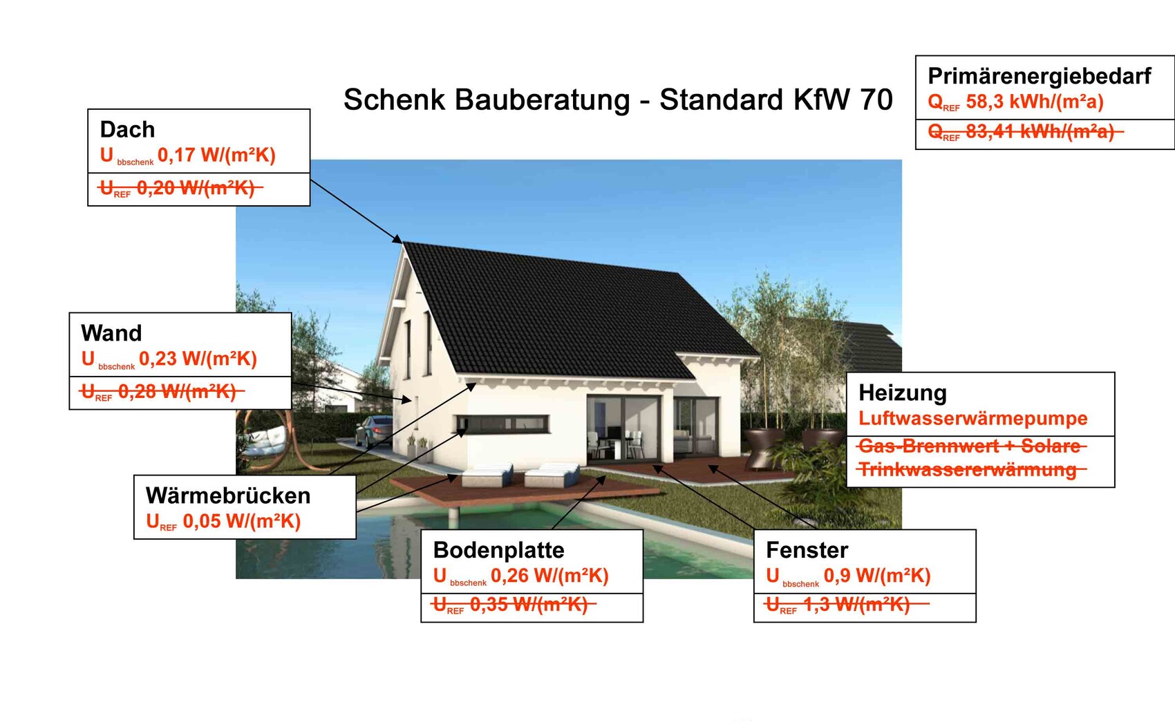 Dach: 0,17 W/(m2K) => Referenzgebäude 0,20 W/(m2K)