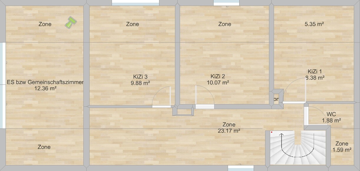 Alle Zimmerchen heißen Zone, daher ist die Benennung einzelner Räume schwierig. Ich vermute, das winzige Räumchen mittig (gegenüber Treppe) ist eine Toilette? Kann man die auch ganz unten rechts platzieren und stattdessen die beiden Zimmer auf der rechten Hälfte der Zeichnung etwas größer gestalten? Könnt Ihr zusätzliche Einbauschränke o.ä. im breiten Flur unterbringen? Dann hätten die Kinder in ihren Zimmern mehr Platz.